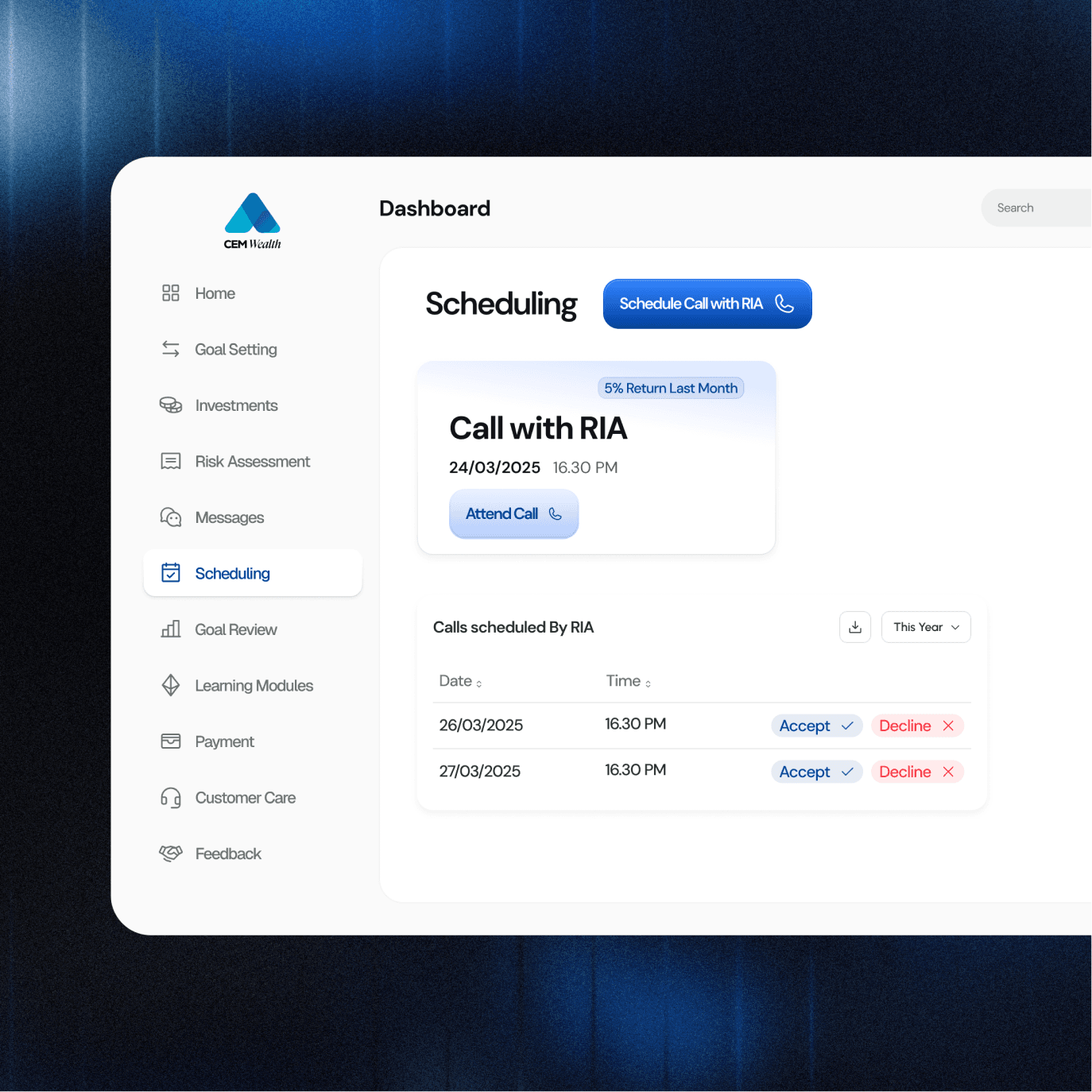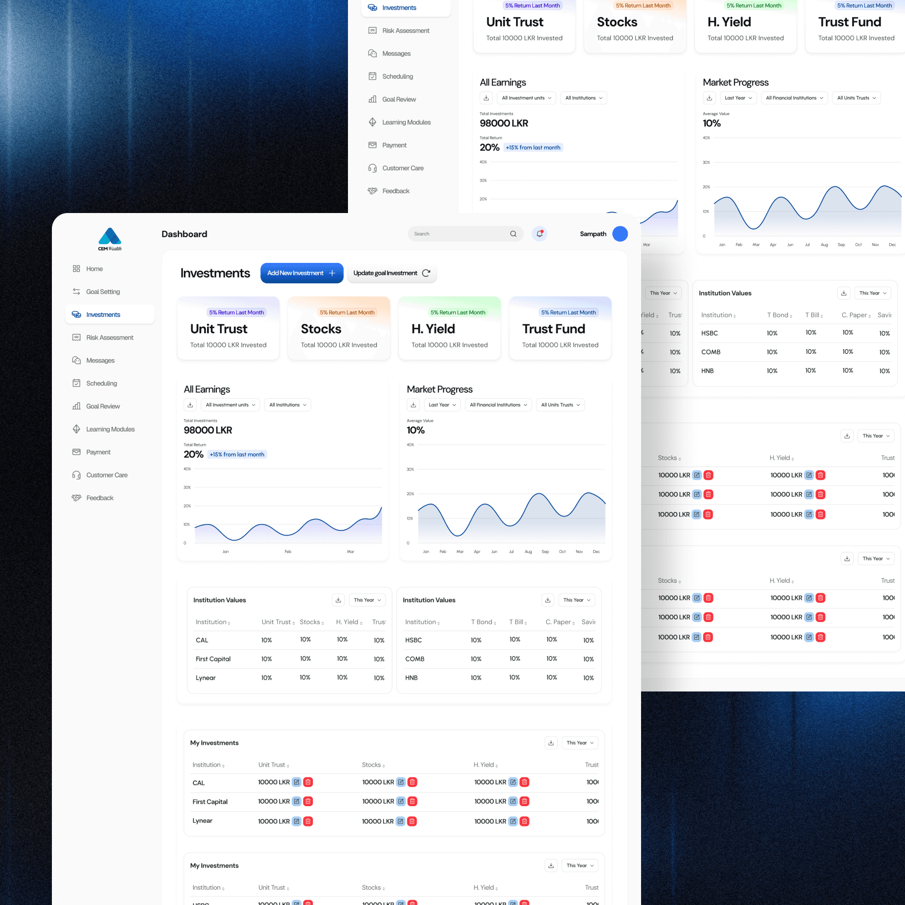 CEM Wealth is a strategic digital transformation of the traditional investment landscape in Sri Lanka. Recognizing a significant "Financial Literacy Gap," we designed a dual-sided dashboard ecosystem that bridges the divide between retail investors and Registered Investment Advisors (RIAs).