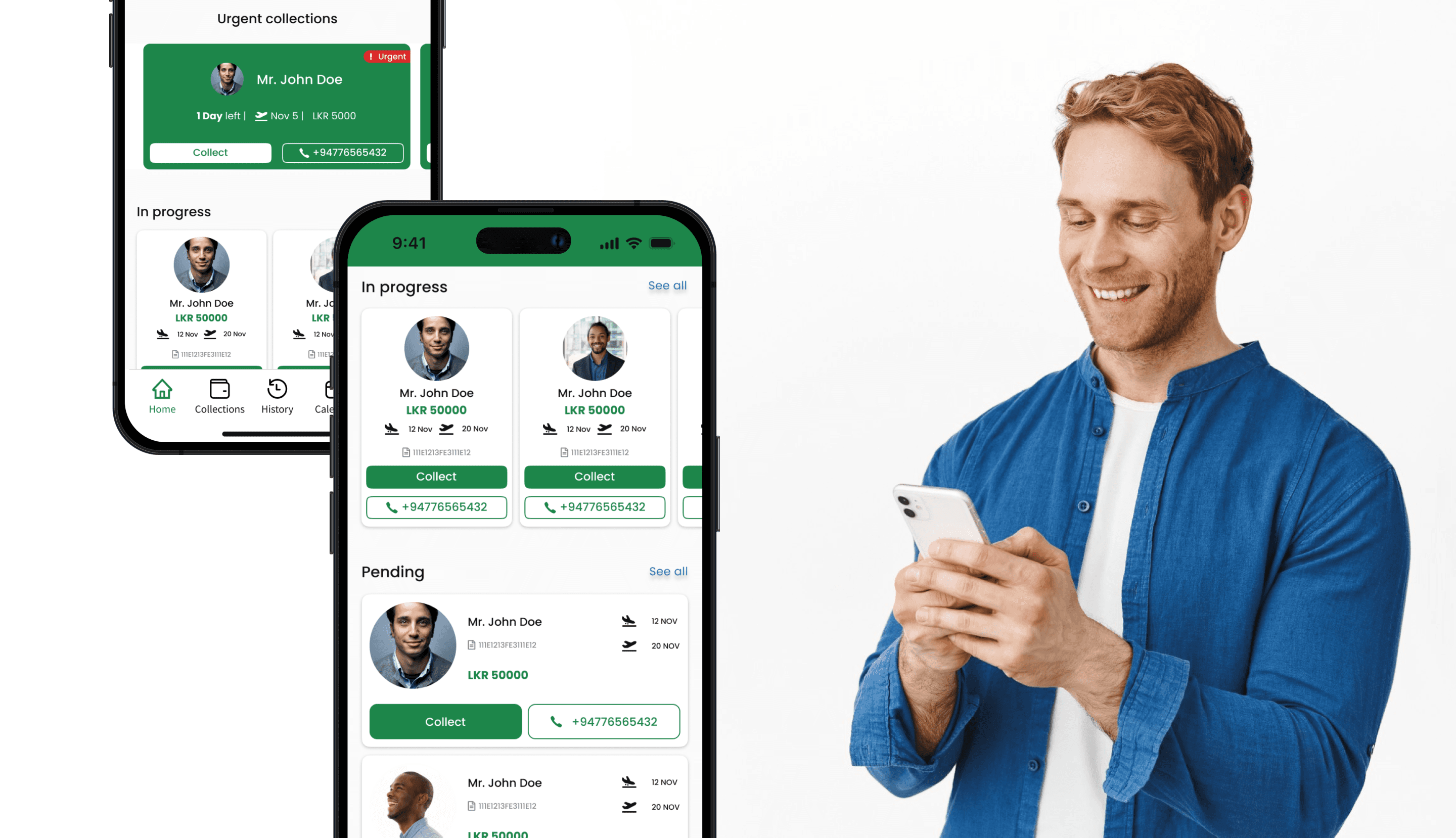 Collection screen displays all the collections assigned to the payment collector. They are given features sort all the collections by; urgent payments; in progress payments and pending payments.