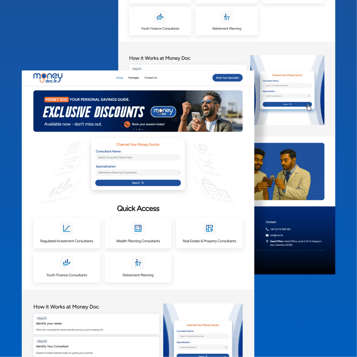 The final landing page for Money Doc serves as the primary touchpoint for democratizing financial expertise. By synthesizing user research with a "Search-First" architecture, I transformed a high-friction consulting process into an intuitive, accessible digital experience. Every design element on this page is a direct response to a validated user pain point.