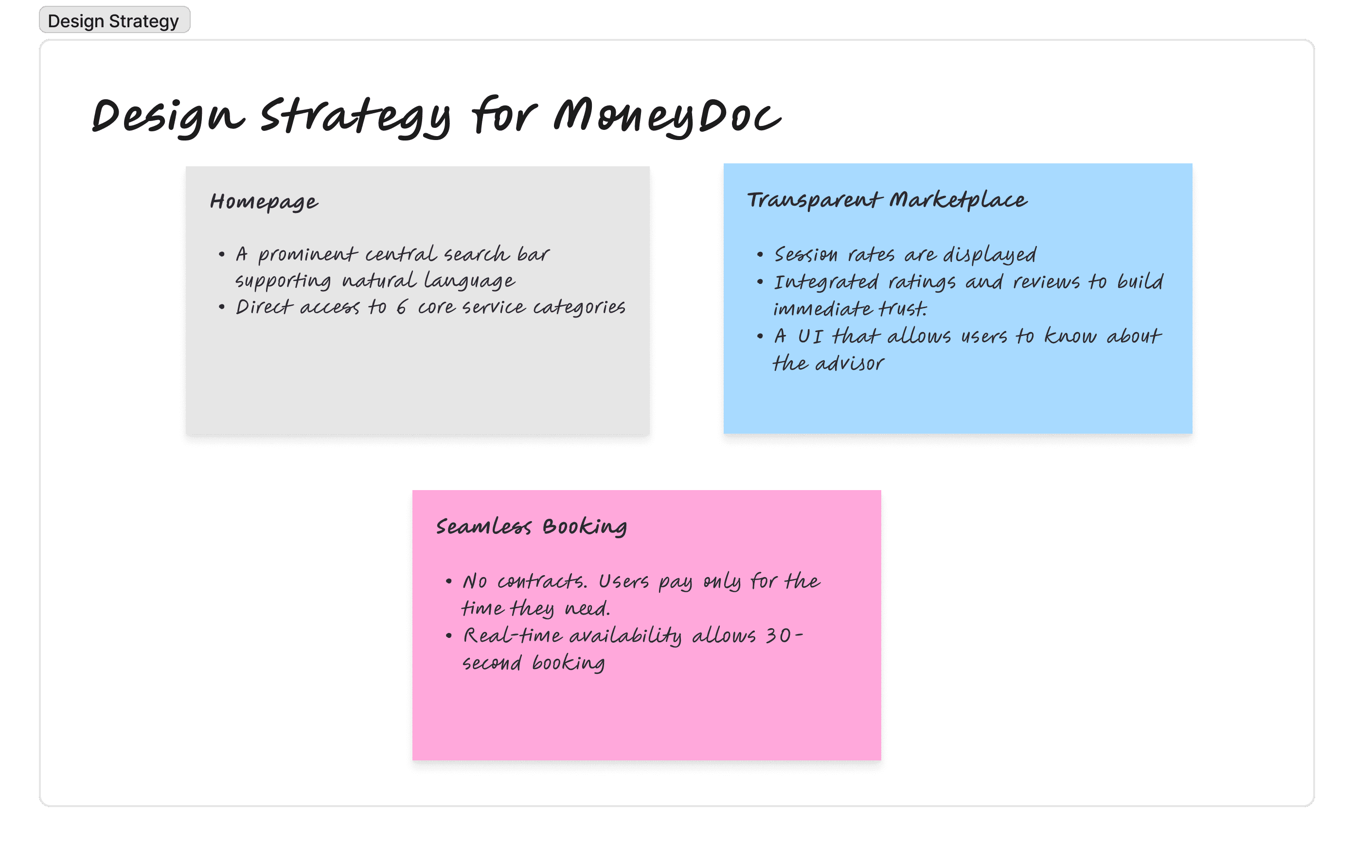 I developed a three-pillar design strategy for Money Doc. This framework ensures that every touchpoint from the first search to the final booking