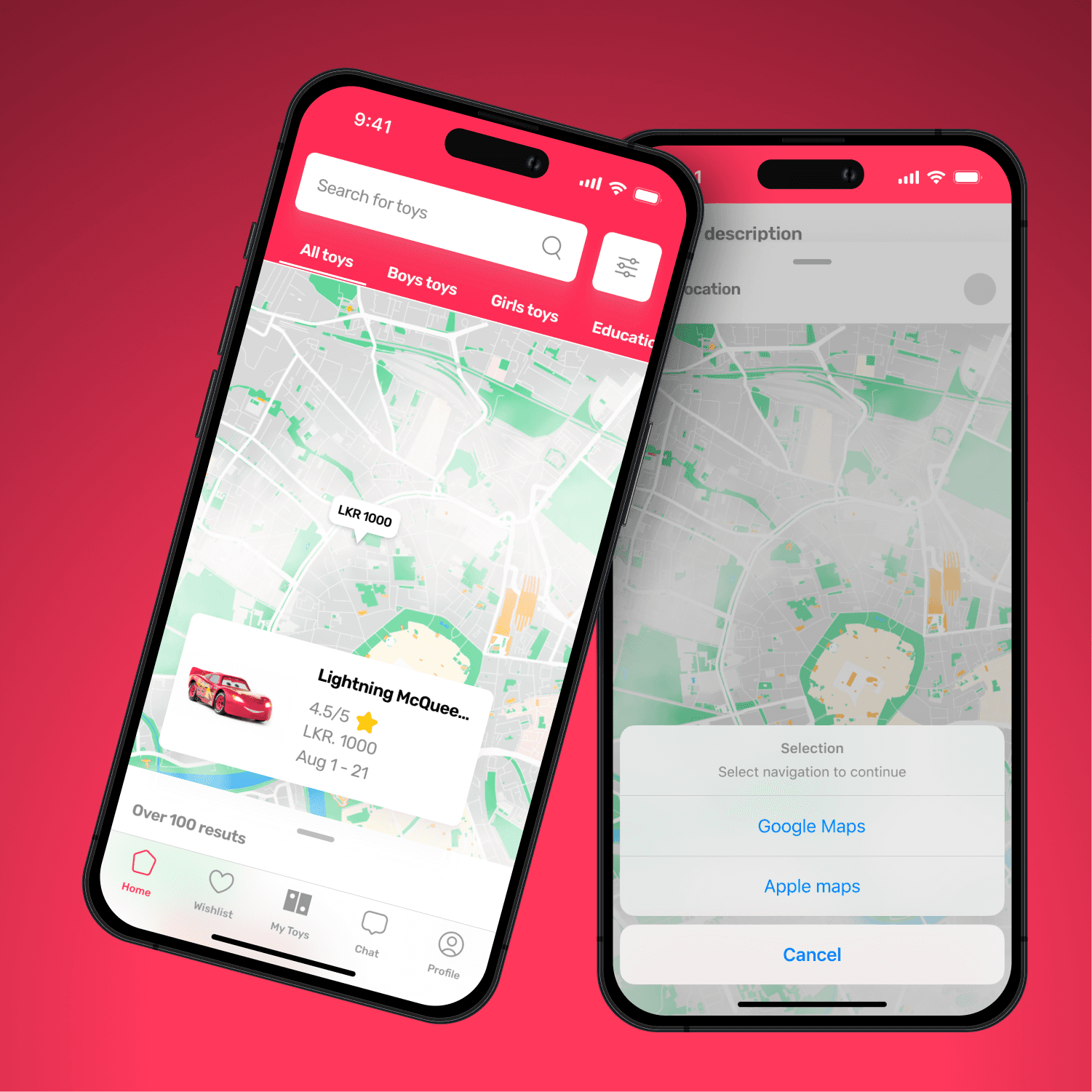 The available toys are displayed on the home screen for the user, so they don't have to hustle around adding their location. Users can drag down interface to view the available toys on the map as well.